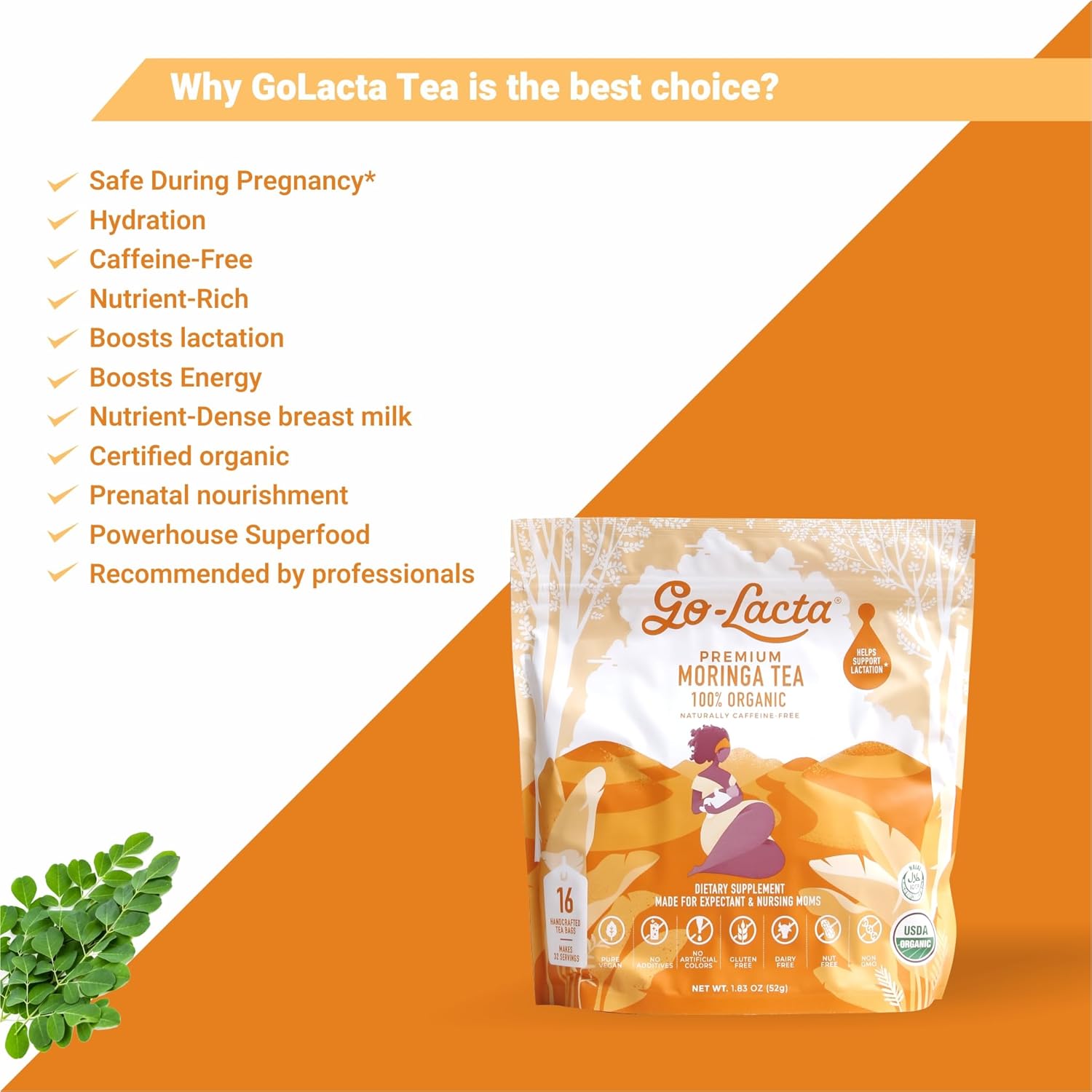 The best lactation tea trusted by breastfeeding moms and lactation consultants worldwide. Go-Lacta Organic Moringa Tea is a plant-based, all-natural milk booster that helps moms produce more breast milk — fast!